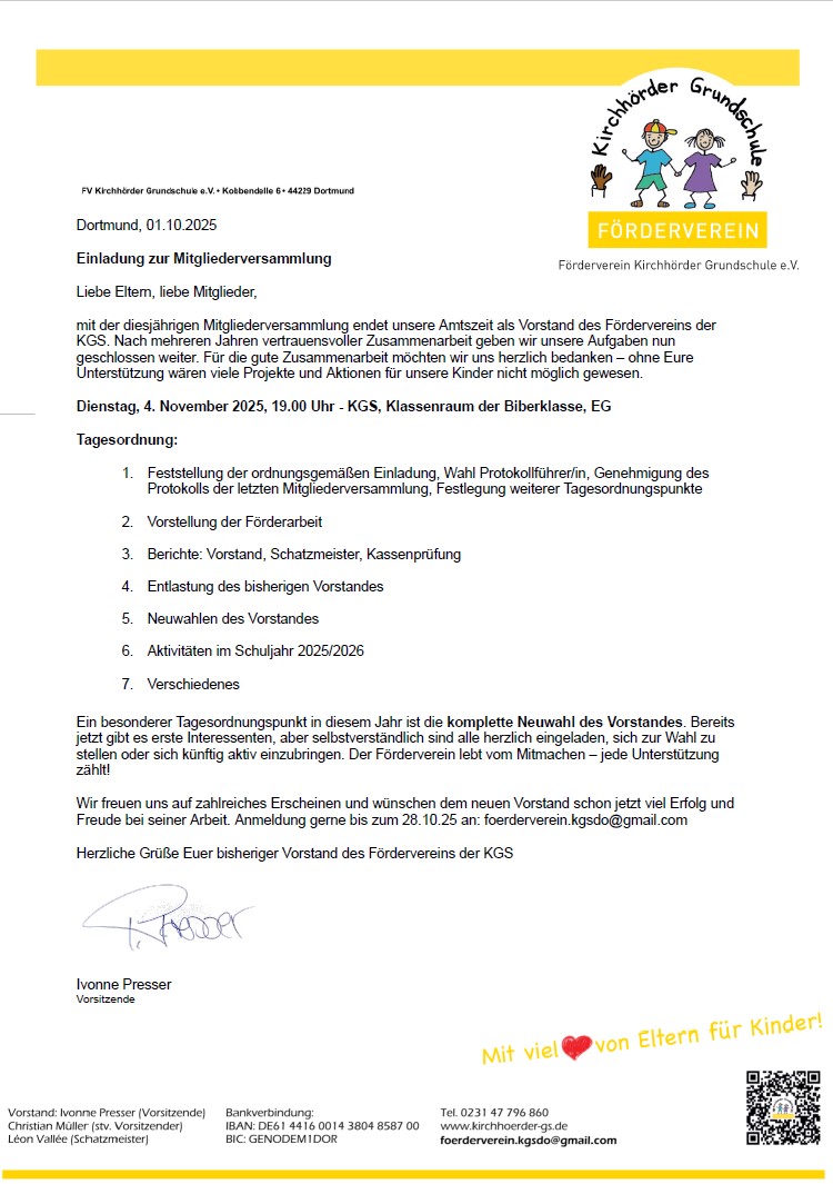 Der Förderverein der Kirchhörder Grundschule lädt zu seinen Jahreshauptversammlung am 4. November 2025 ein.